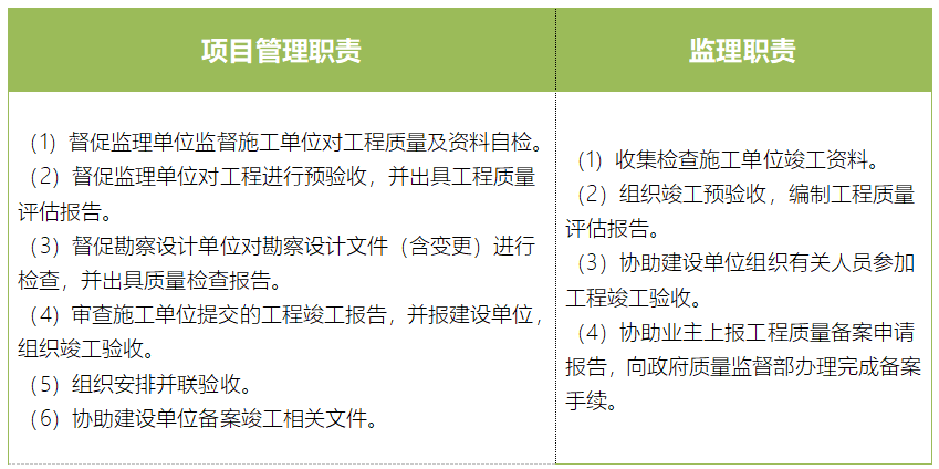 但从项目管理和监理的职责对比分析可以看出项目管理更多的是接受业主委托行使统筹协调管理的职责,特别是在项目前期的报批报建和项目建设准备期的各项工作,而监理更多的是在项目实施阶段旁站和质量、进度、安全及竣工验收的服务。项目管理更全面,服务时间更长。由一家全咨单位提供服务,责任更明确,减少互相推诿和多方协调的工作,工作并不重叠。